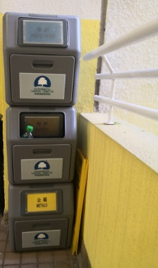 Recycling cabinets of metal, plastics and waste paper on the ground floor